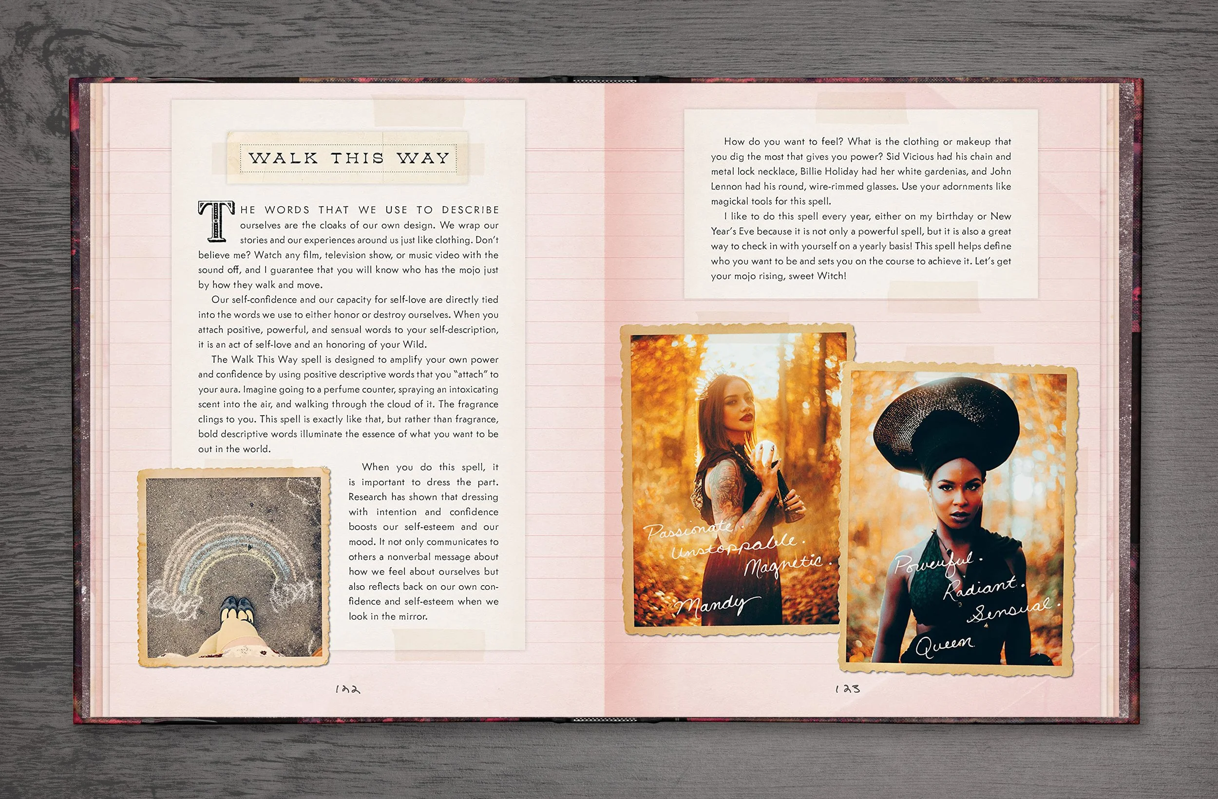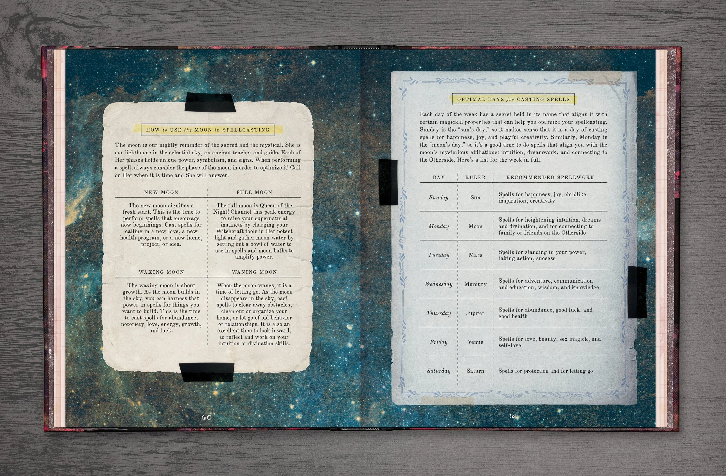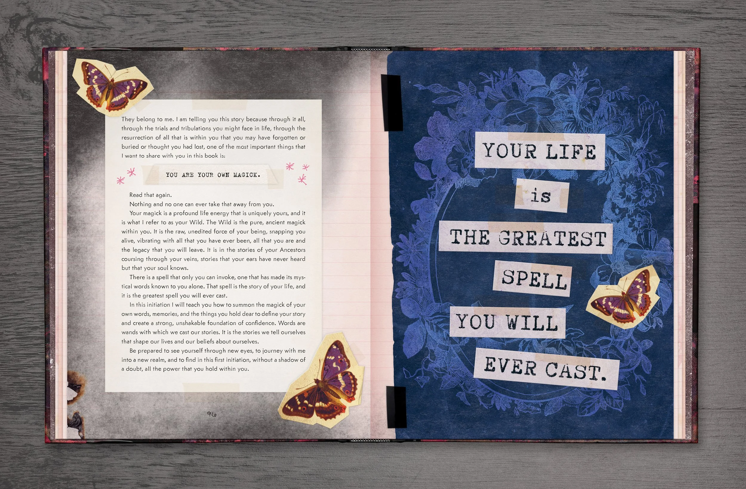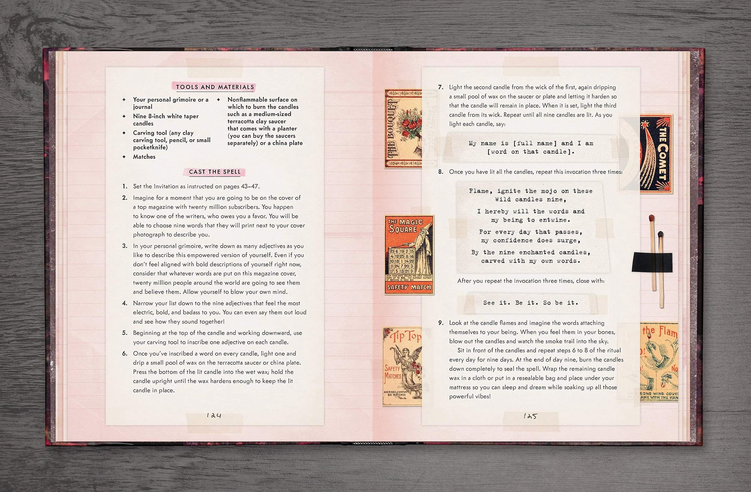 An enchanting handbook for aspiring witches filled with potent spells that's designed and collaged using my own vintage ephemera collection and handwriting. The cover features debossing, spot gloss on the pieces of tape, and a golden foil stamp.