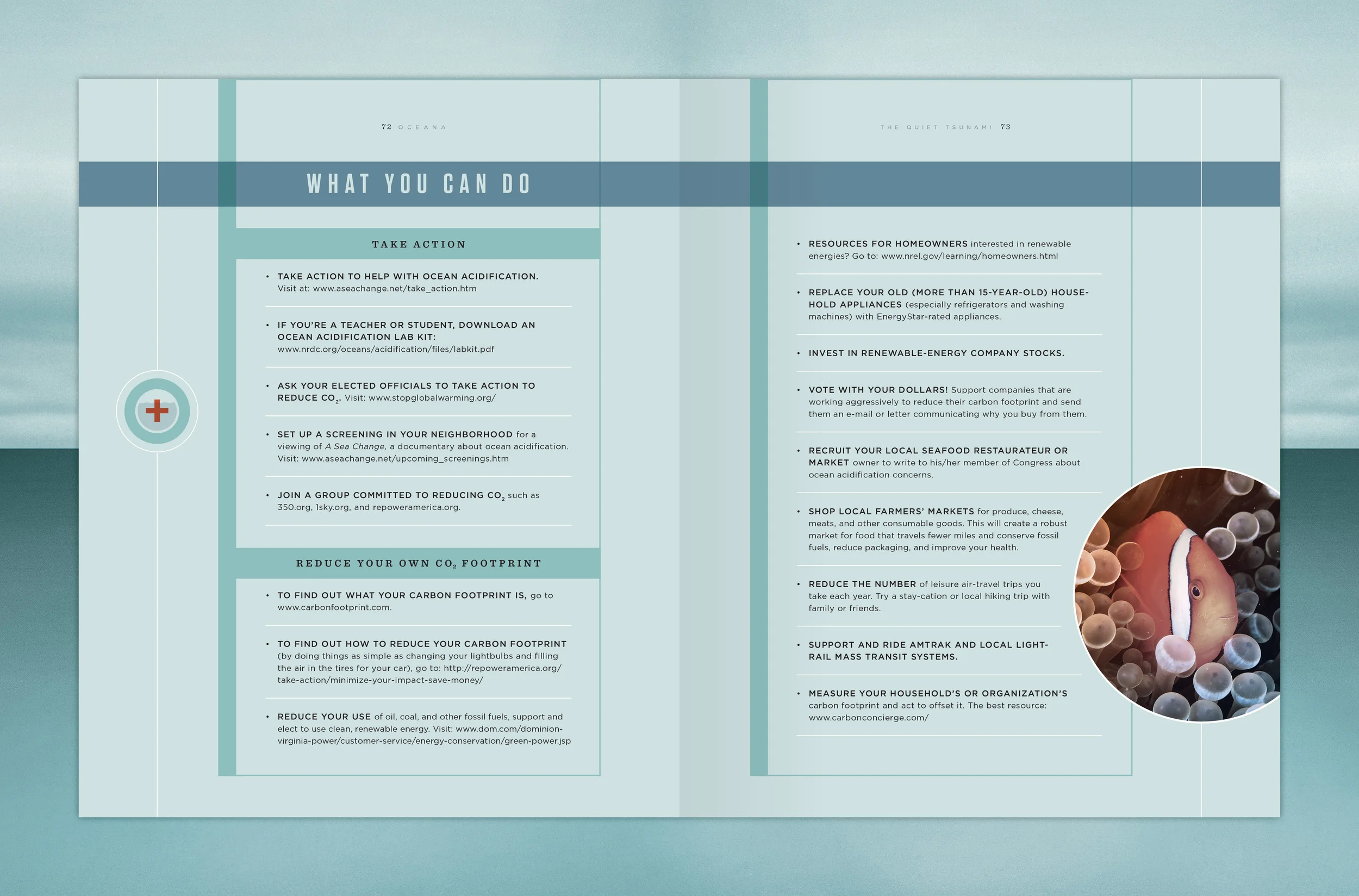 Using graphics and charts, every inch of space was thoughtfully put to use as an opportunity to illustrate a story, invite the reader to discover an important fact, or inspire them to make a change.