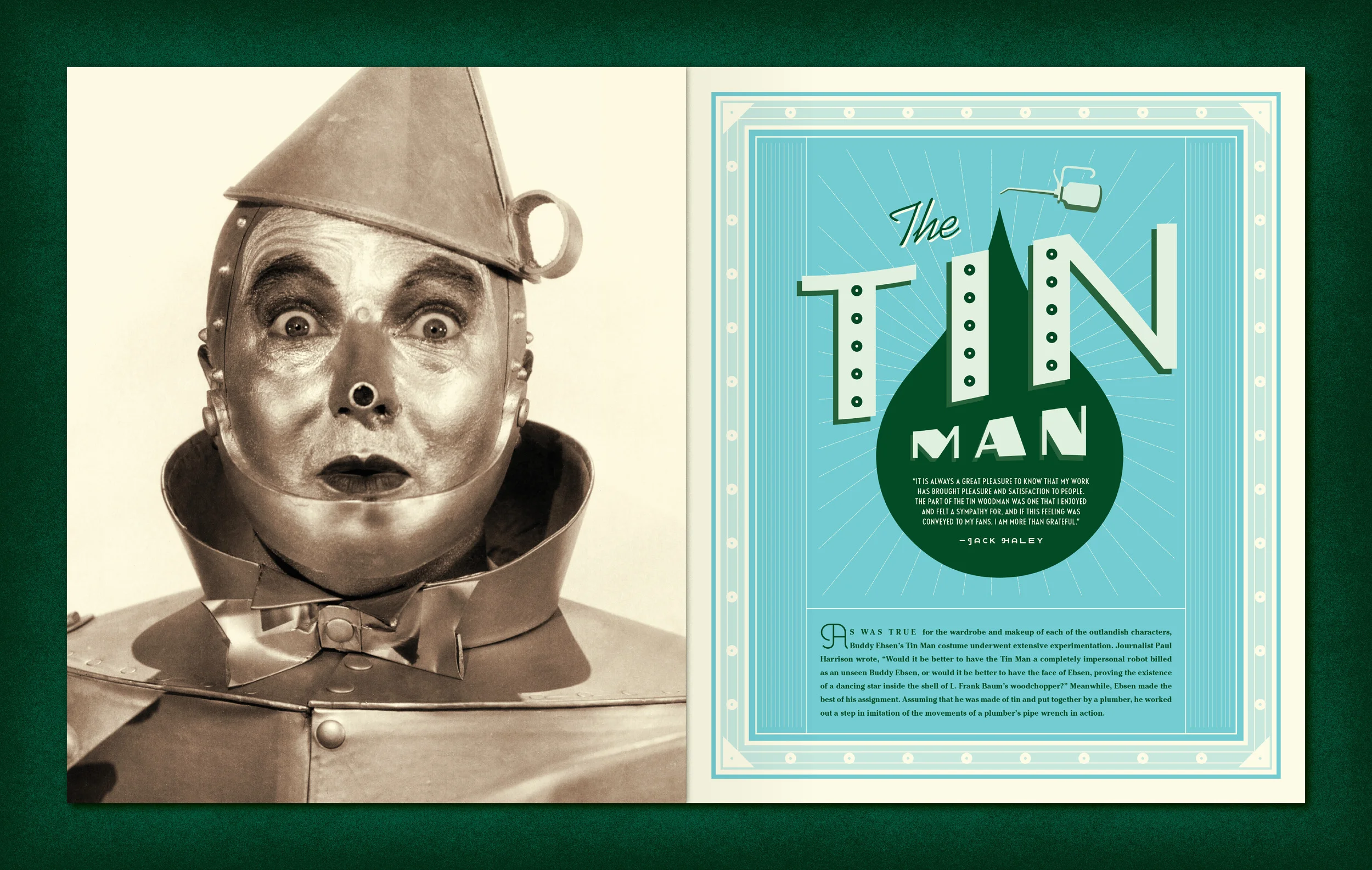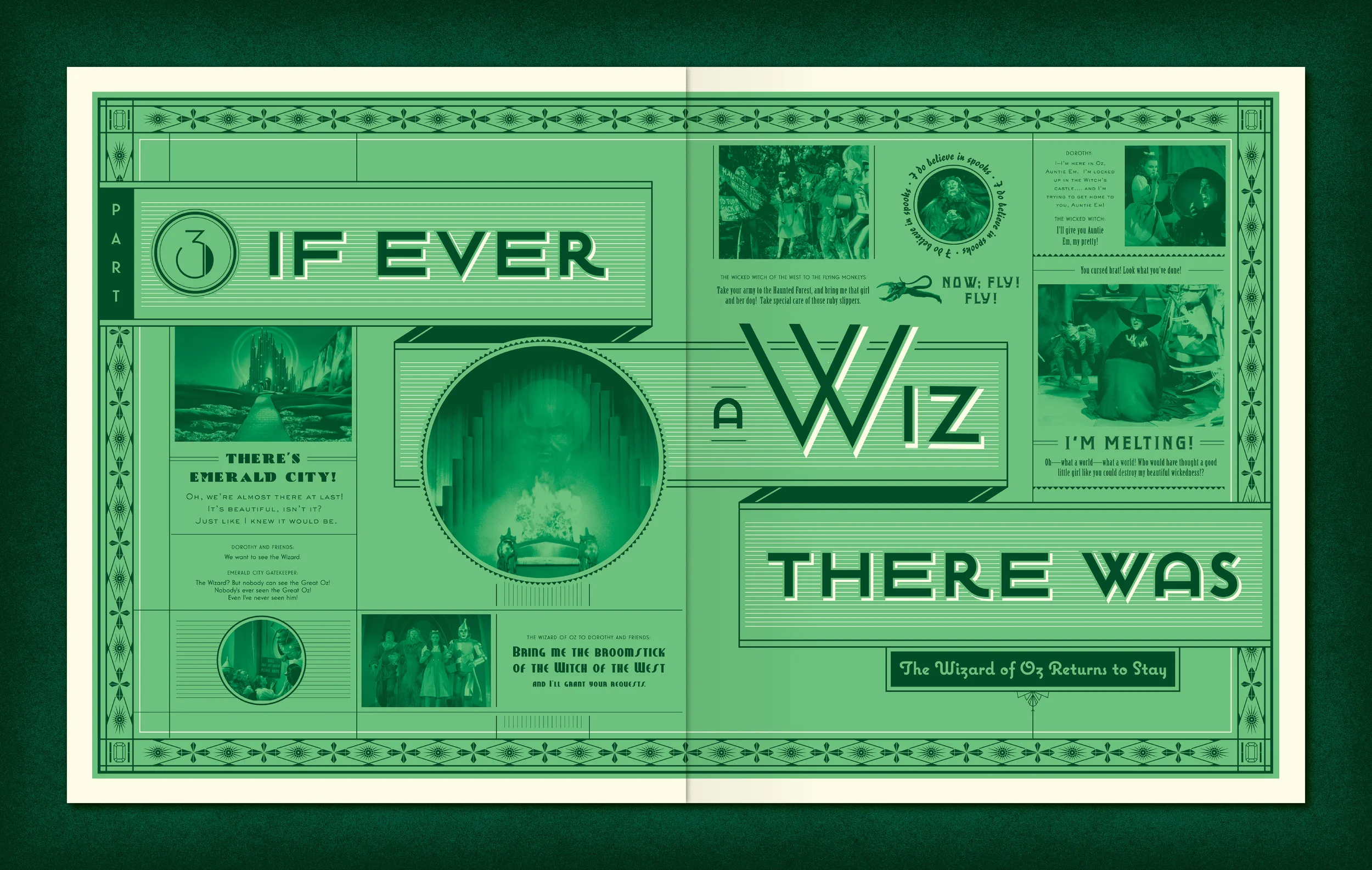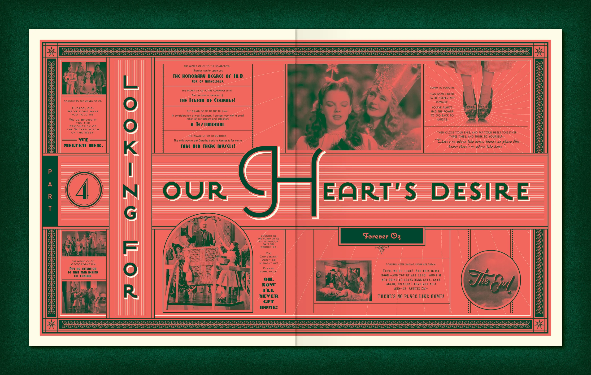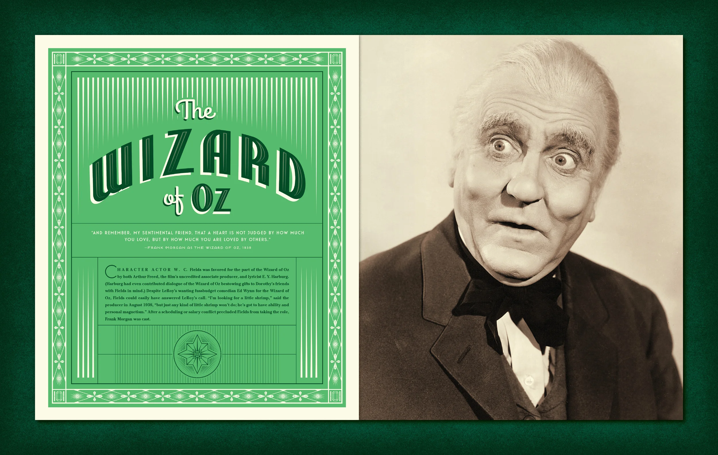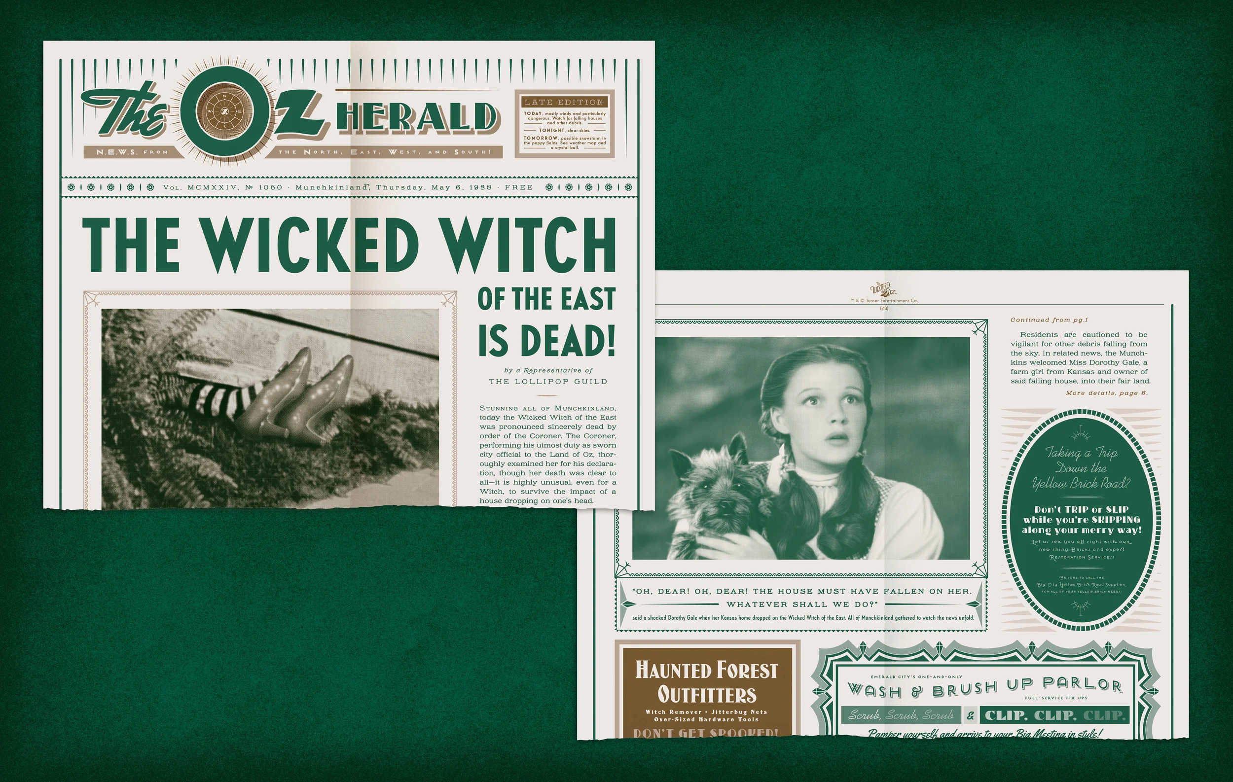 The book holds a removable silver envelope in the back containing the nine special features, including a reproduction of the Wicked Witch of the East’s death certificate (which no longer exists, so I redrew the iconic typography and even filled out the certificate as the coroner), a fictional but in-depth custom newspaper page for The Oz Herald (which I contributed copy for headlines and advertisements), an intricate die-cut picture frame that houses different character portraits, and certificates from the Wizard himself for Courage, Brains, Heart, and Home (referencing the typography on the side of Professor Marvel’s wagon to recall the Wizard’s Kansas character). Also included are re-printings of actual vintage posters, a bookmark (designed using vintage elements), lobby cards, etc.