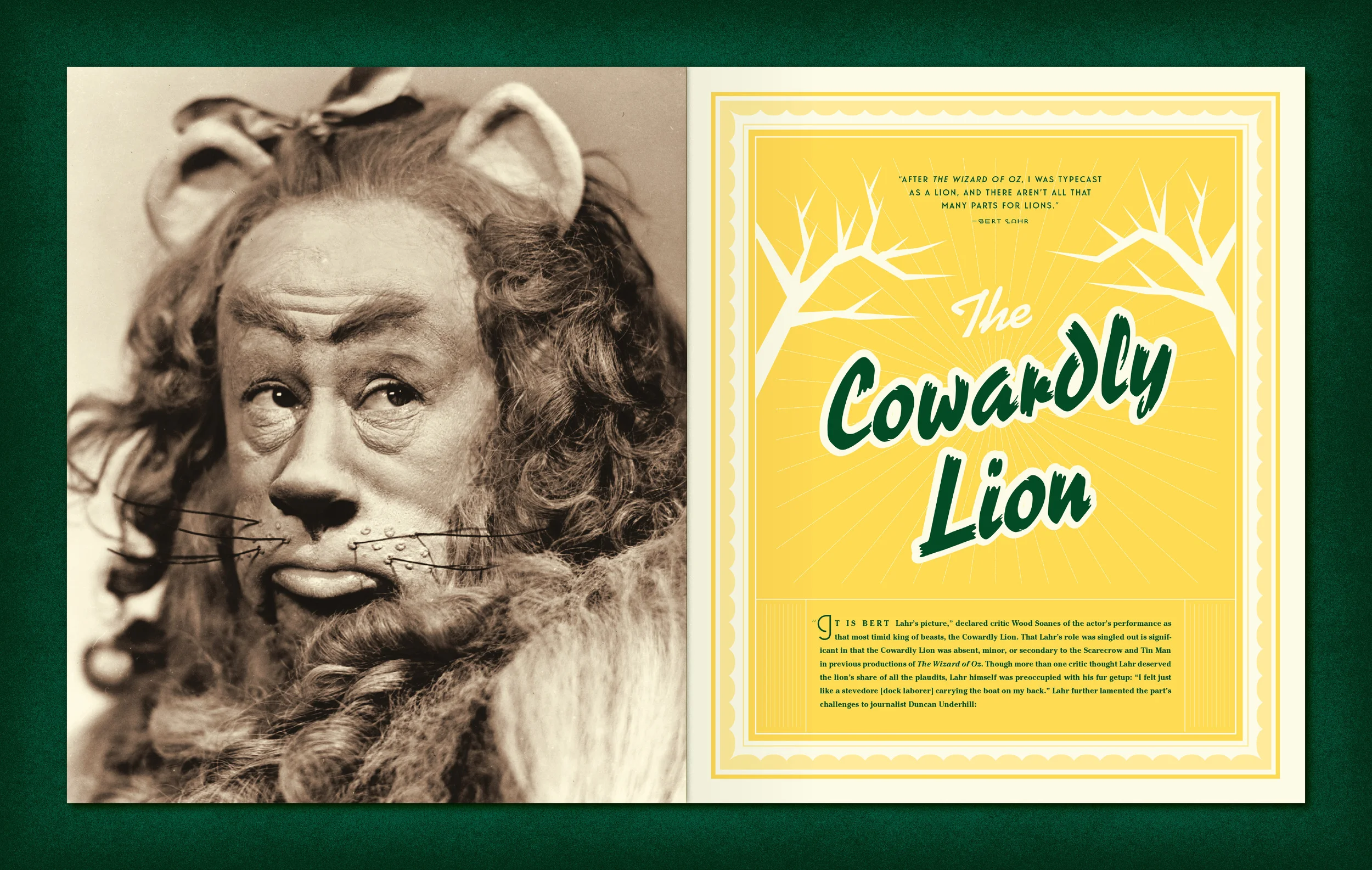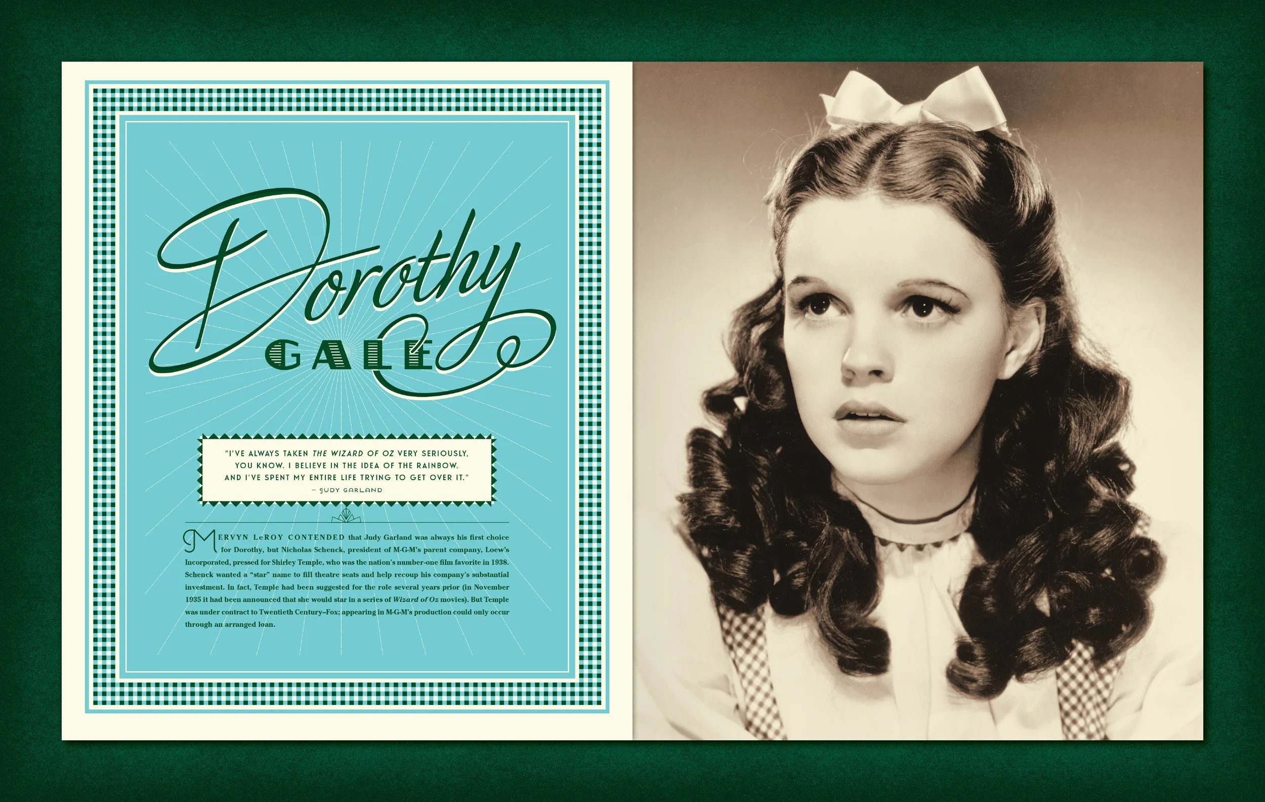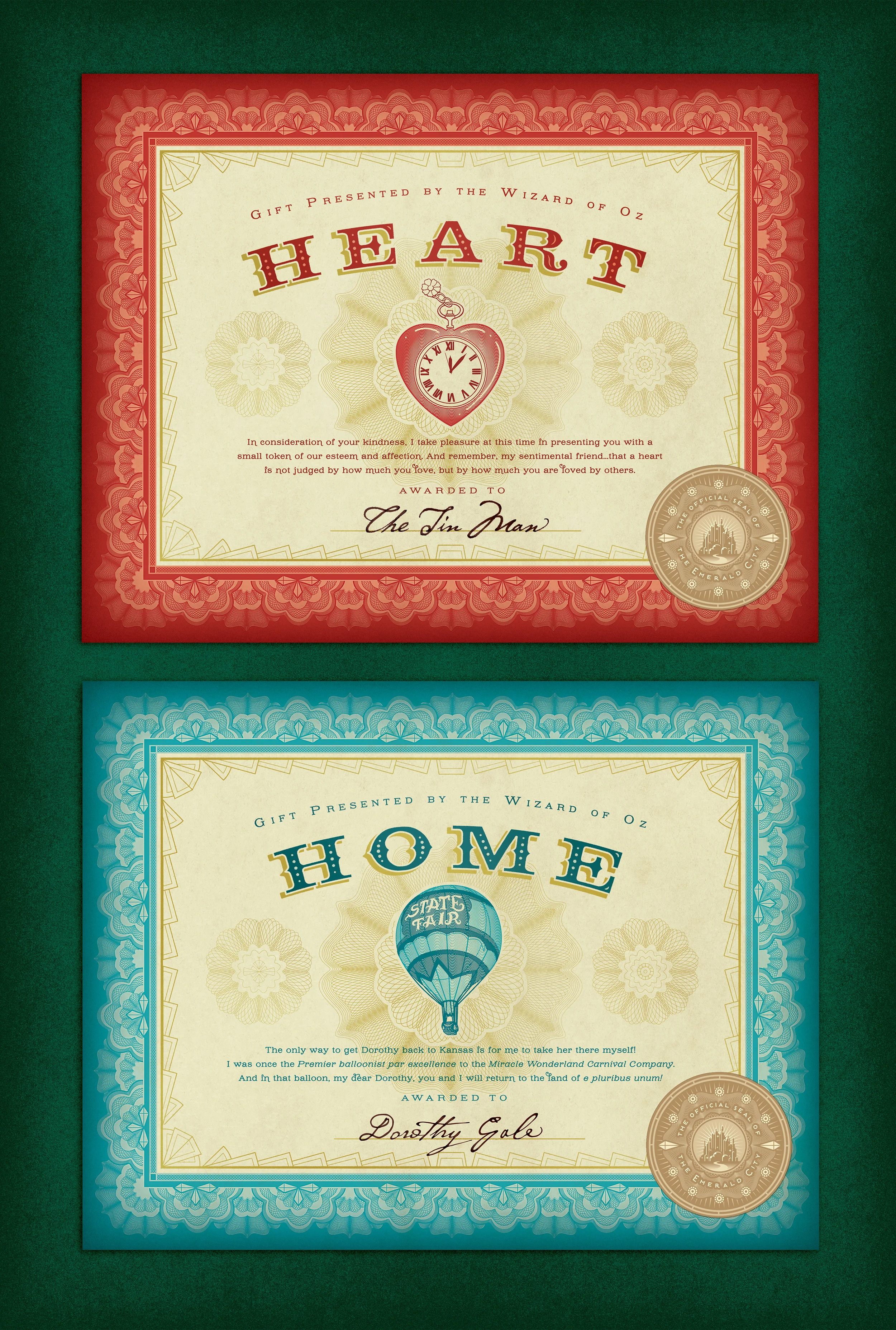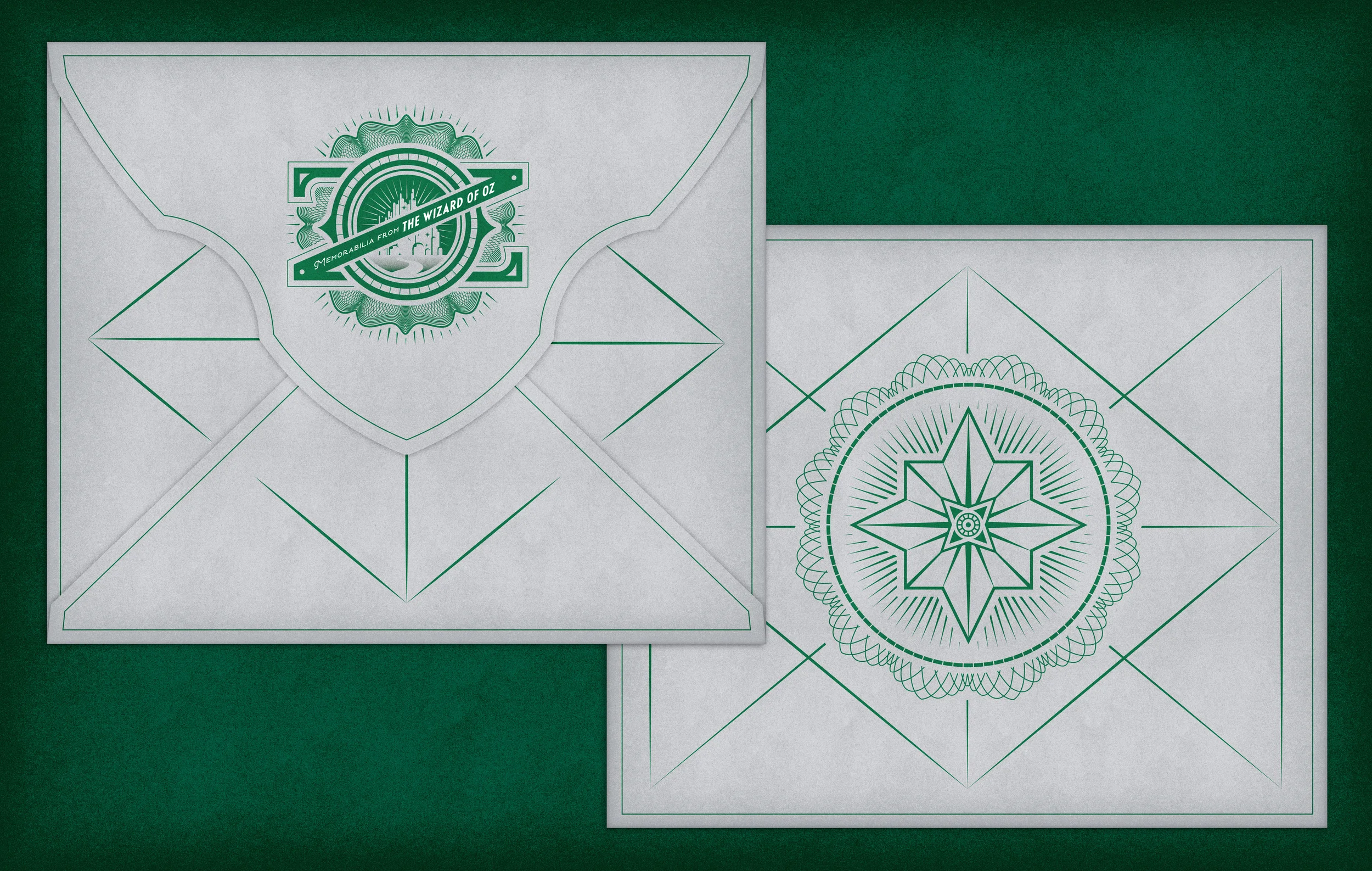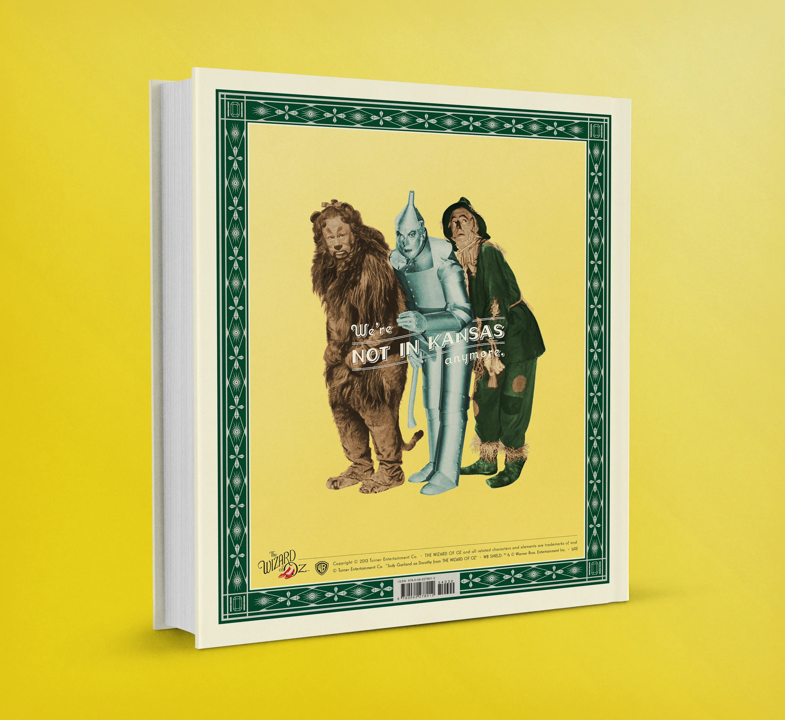The book holds a removable silver envelope in the back containing the nine special features, including a reproduction of the Wicked Witch of the East’s death certificate (which no longer exists, so I redrew the iconic typography and even filled out the certificate as the coroner), a fictional but in-depth custom newspaper page for The Oz Herald (which I contributed copy for headlines and advertisements), an intricate die-cut picture frame that houses different character portraits, and certificates from the Wizard himself for Courage, Brains, Heart, and Home (referencing the typography on the side of Professor Marvel’s wagon to recall the Wizard’s Kansas character). Also included are re-printings of actual vintage posters, a bookmark (designed using vintage elements), lobby cards, etc.