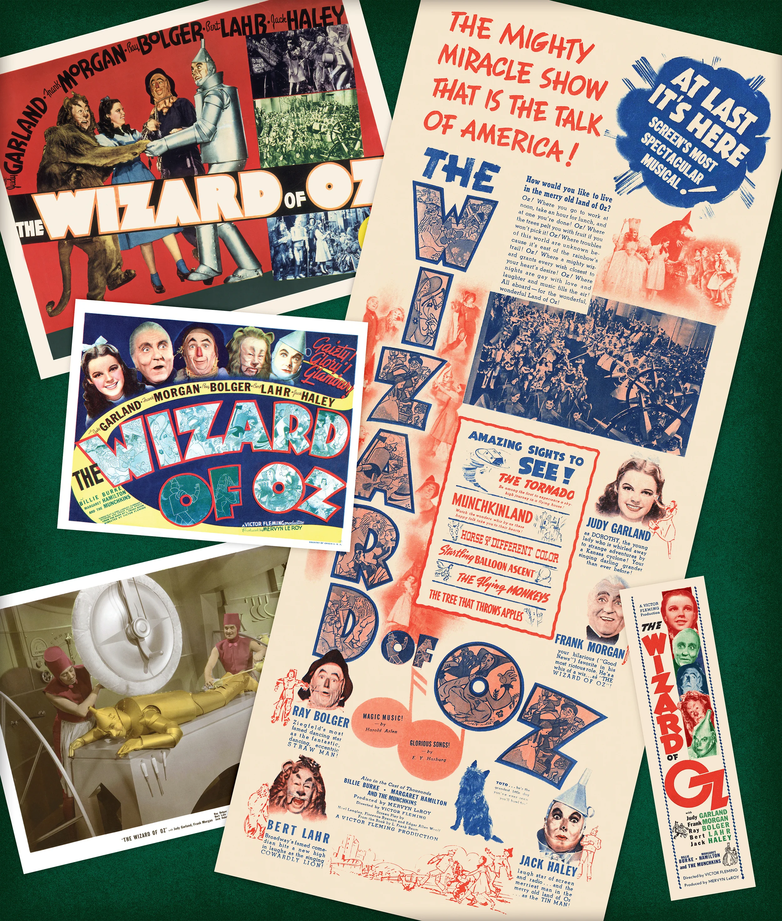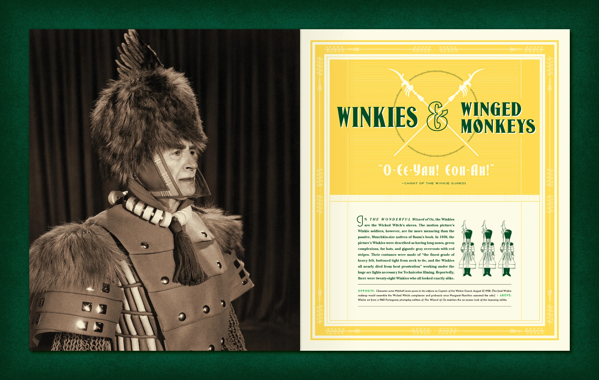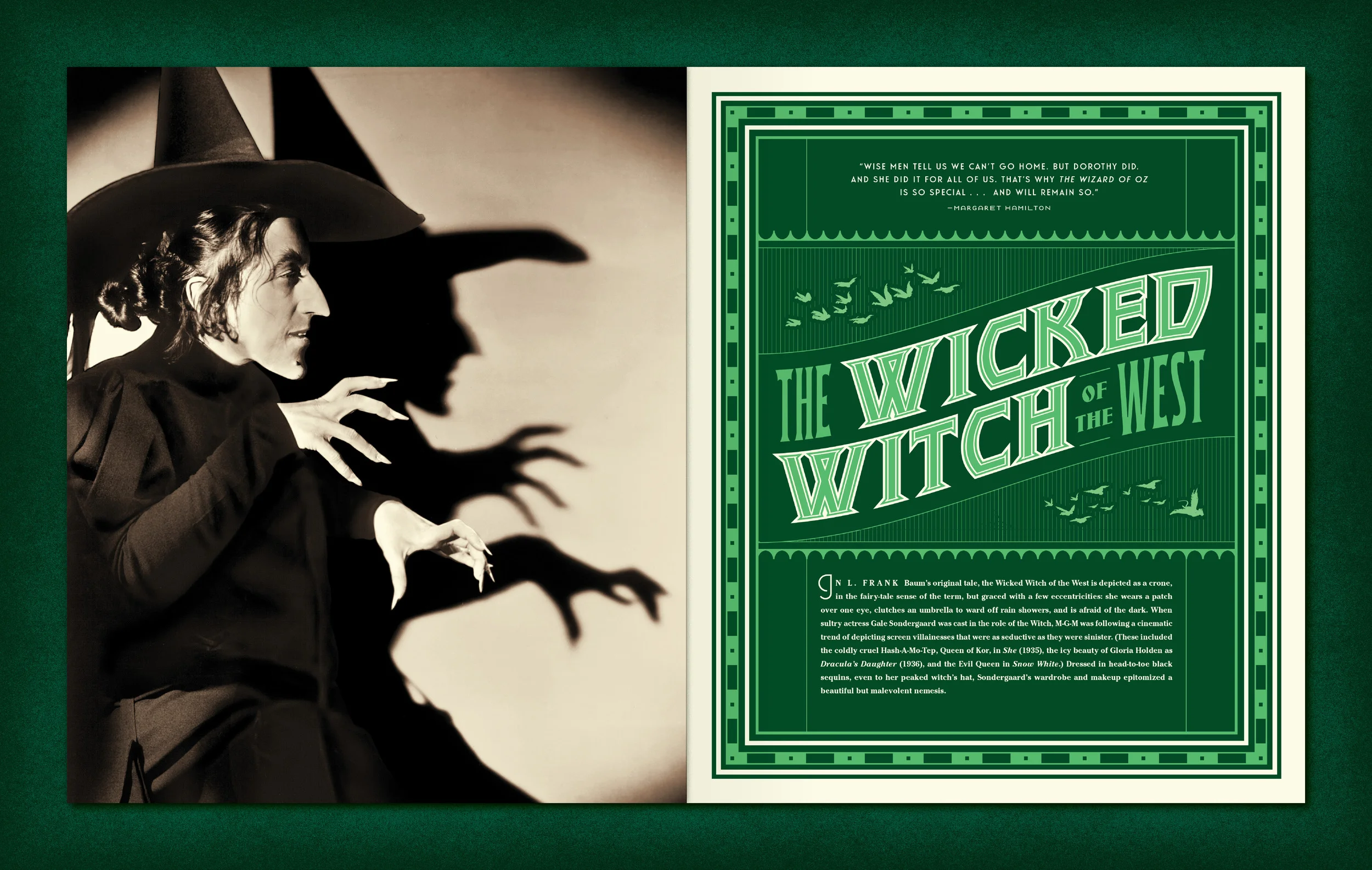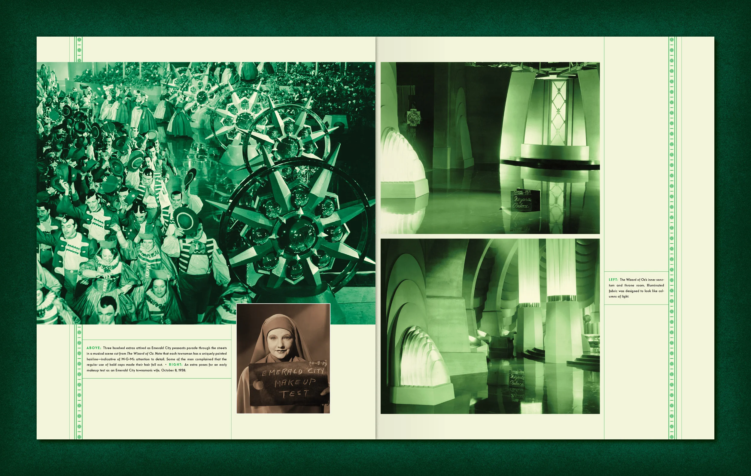 The book holds a removable silver envelope in the back containing the nine special features, including a reproduction of the Wicked Witch of the East’s death certificate (which no longer exists, so I redrew the iconic typography and even filled out the certificate as the coroner), a fictional but in-depth custom newspaper page for The Oz Herald (which I contributed copy for headlines and advertisements), an intricate die-cut picture frame that houses different character portraits, and certificates from the Wizard himself for Courage, Brains, Heart, and Home (referencing the typography on the side of Professor Marvel’s wagon to recall the Wizard’s Kansas character). Also included are re-printings of actual vintage posters, a bookmark (designed using vintage elements), lobby cards, etc.