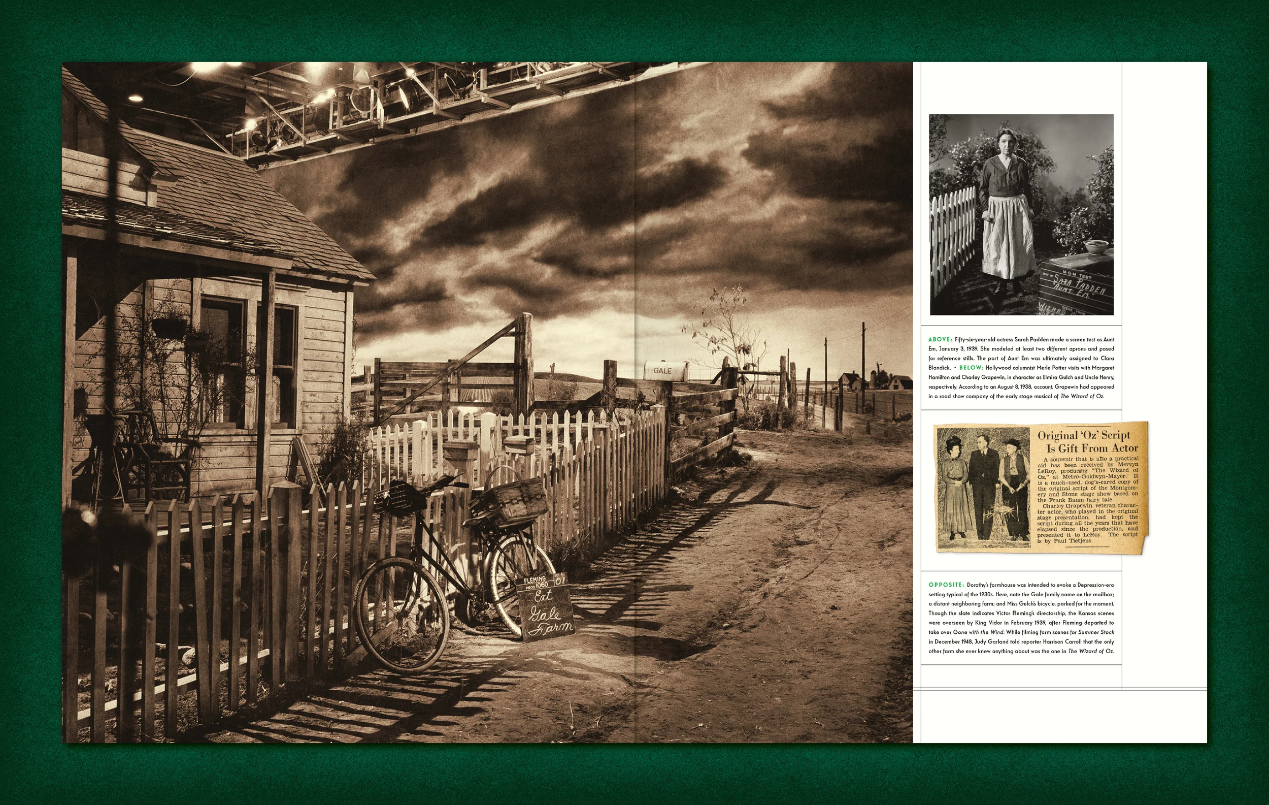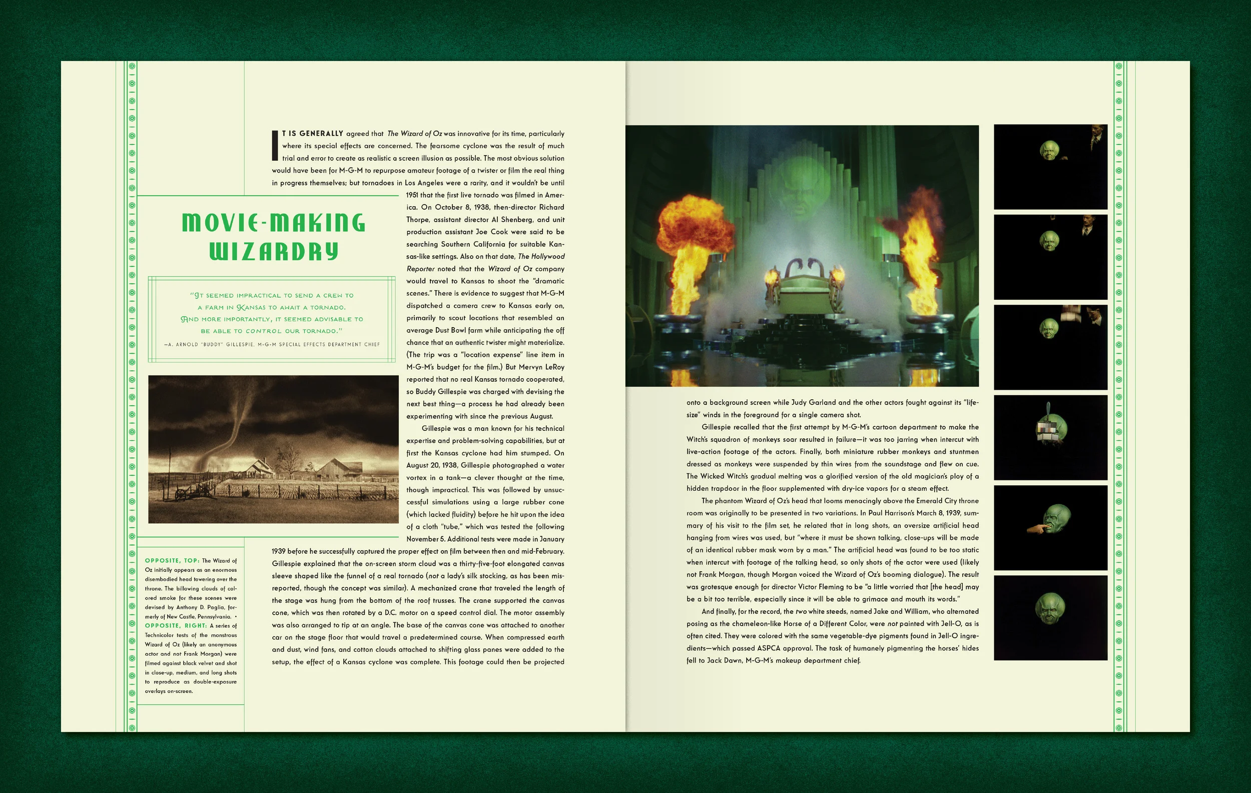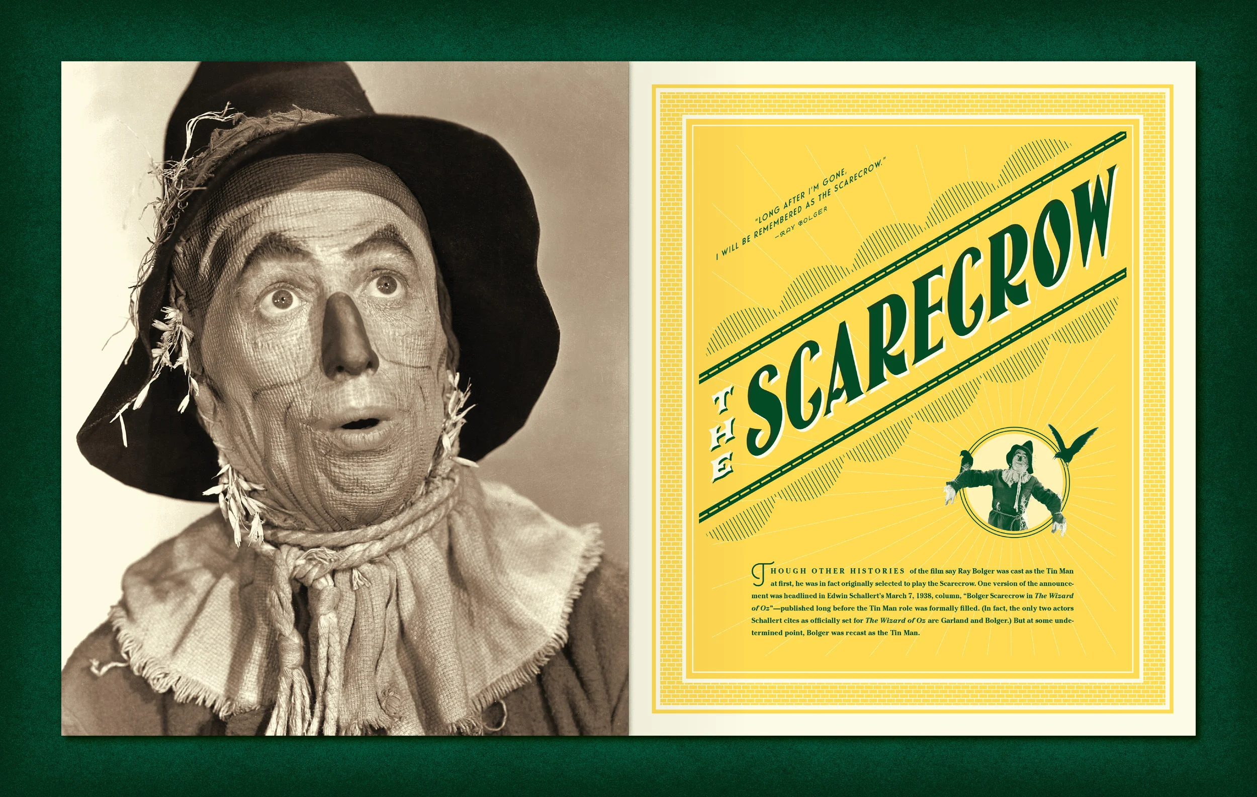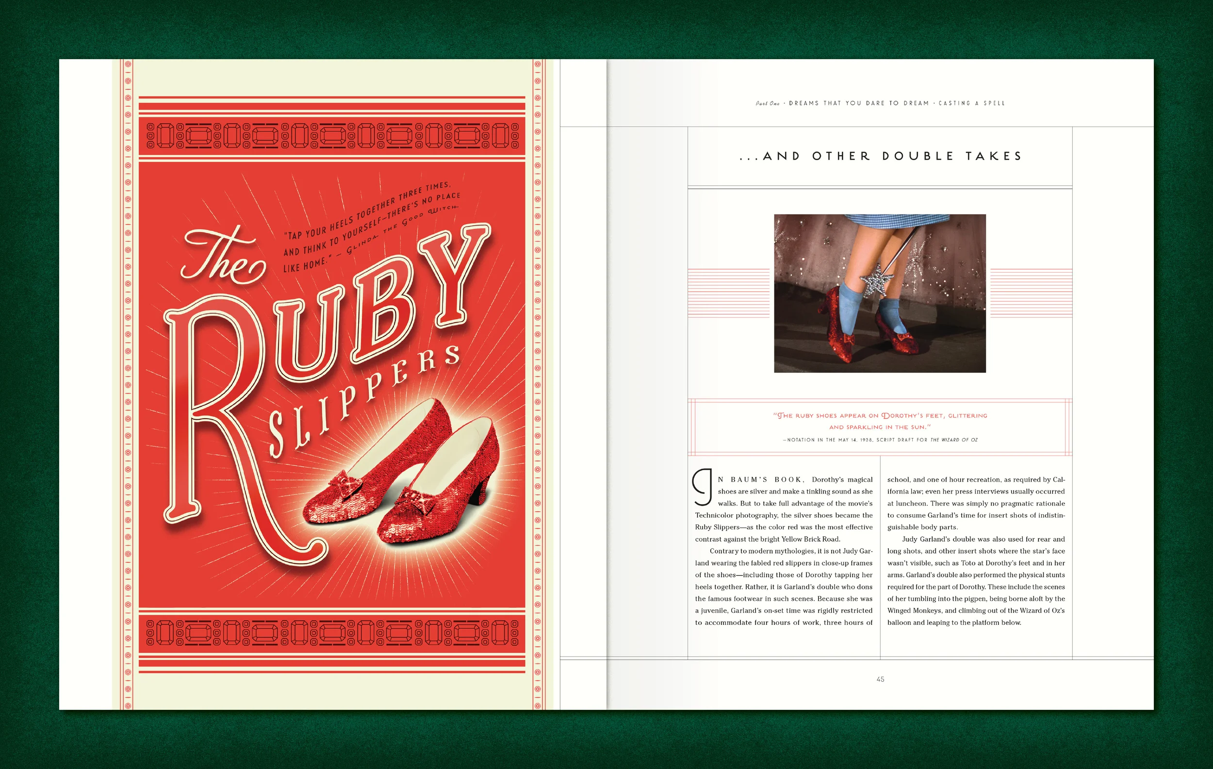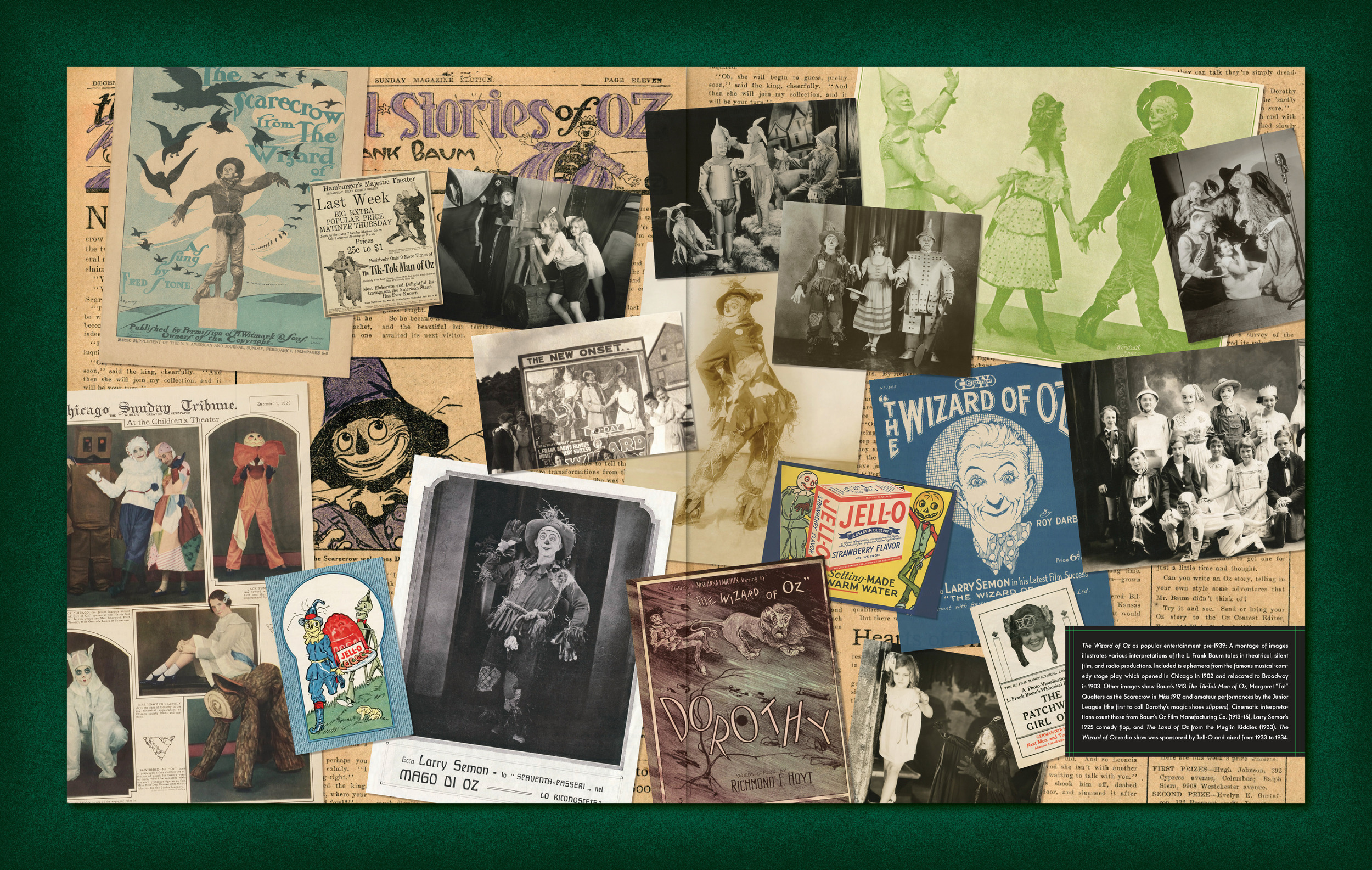 The book holds a removable silver envelope in the back containing the nine special features, including a reproduction of the Wicked Witch of the East’s death certificate (which no longer exists, so I redrew the iconic typography and even filled out the certificate as the coroner), a fictional but in-depth custom newspaper page for The Oz Herald (which I contributed copy for headlines and advertisements), an intricate die-cut picture frame that houses different character portraits, and certificates from the Wizard himself for Courage, Brains, Heart, and Home (referencing the typography on the side of Professor Marvel’s wagon to recall the Wizard’s Kansas character). Also included are re-printings of actual vintage posters, a bookmark (designed using vintage elements), lobby cards, etc.