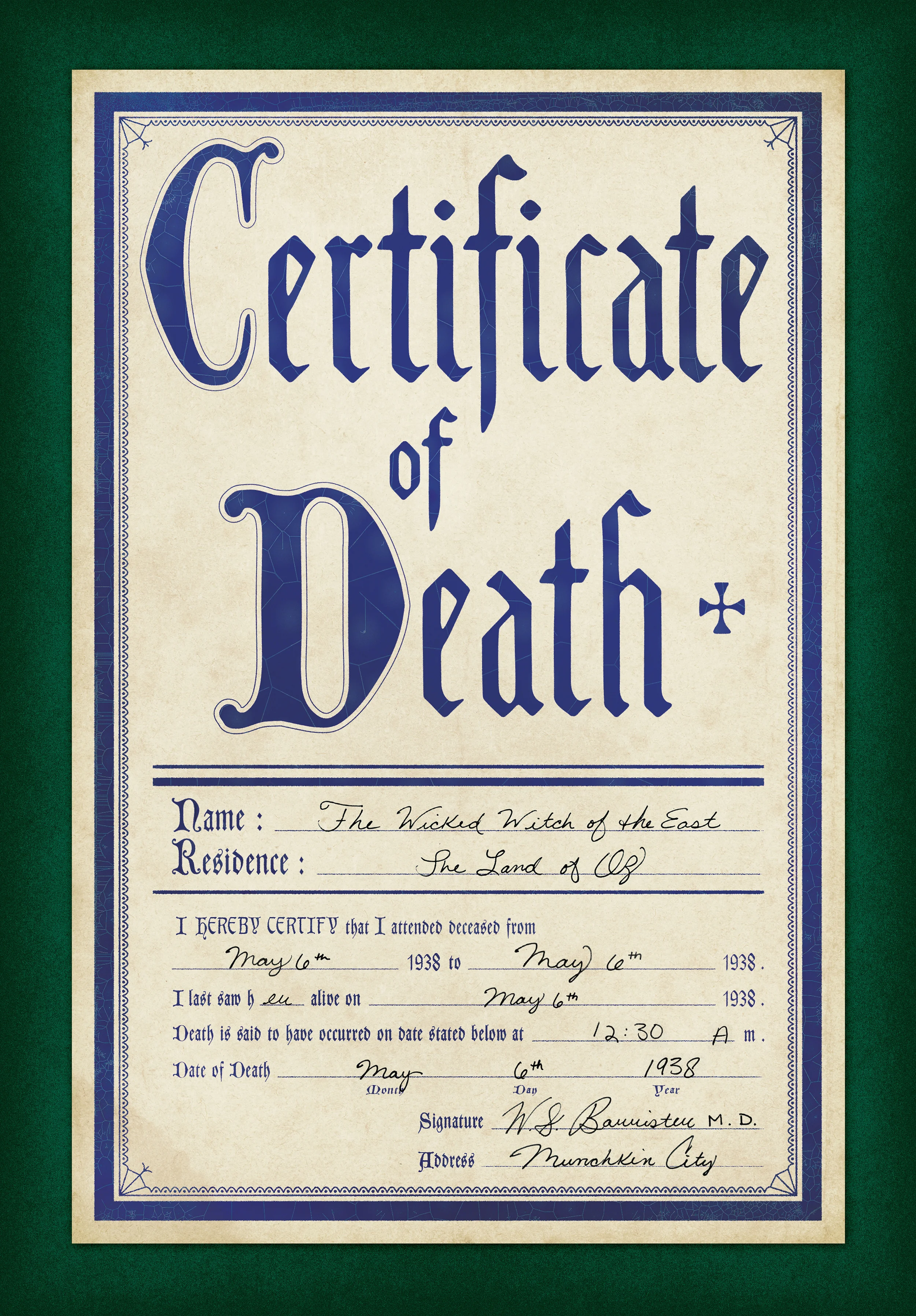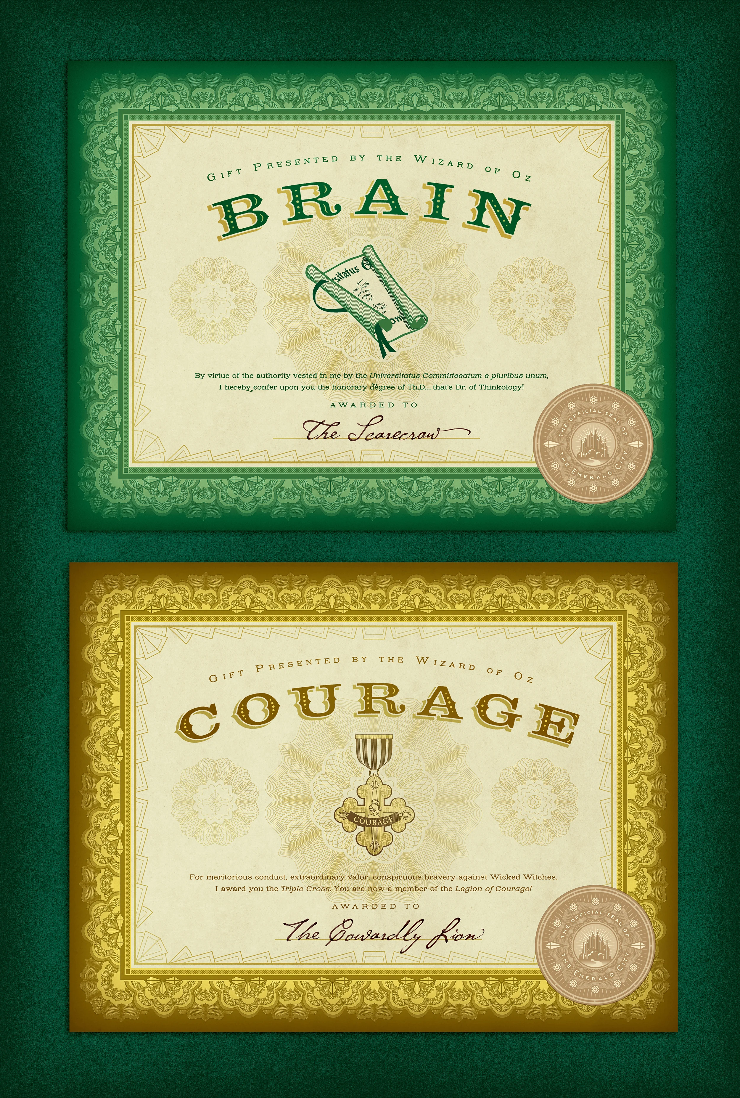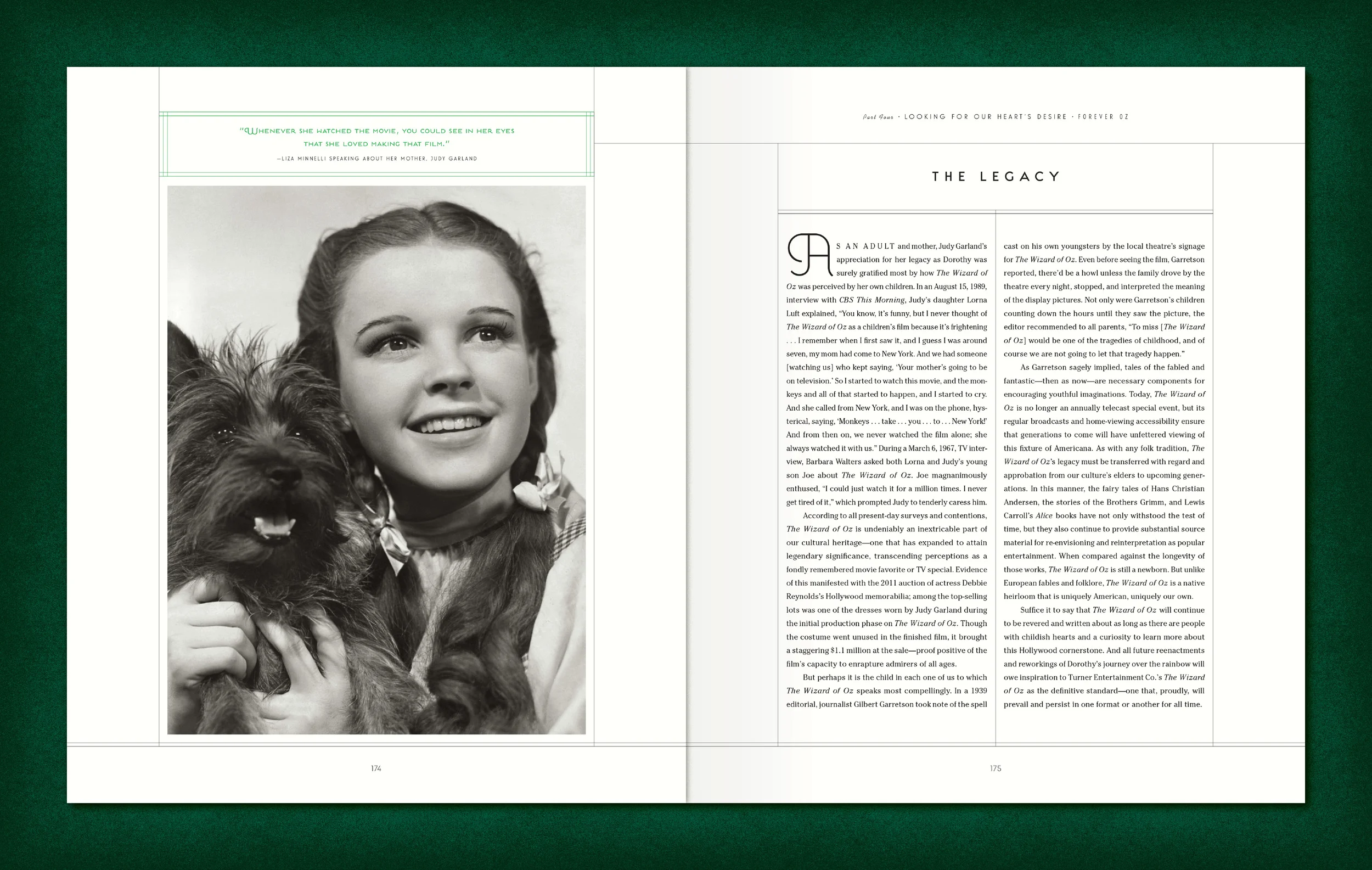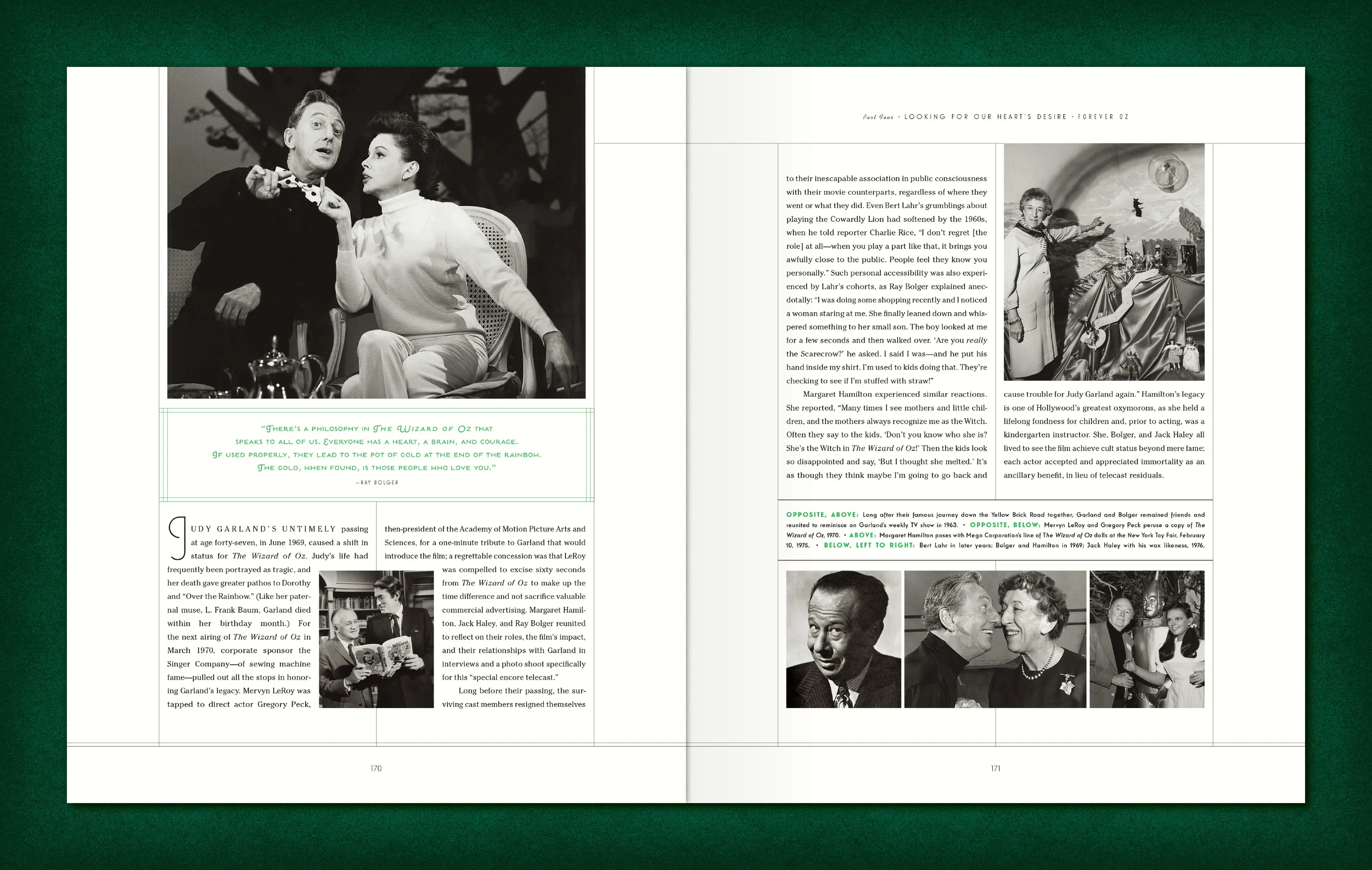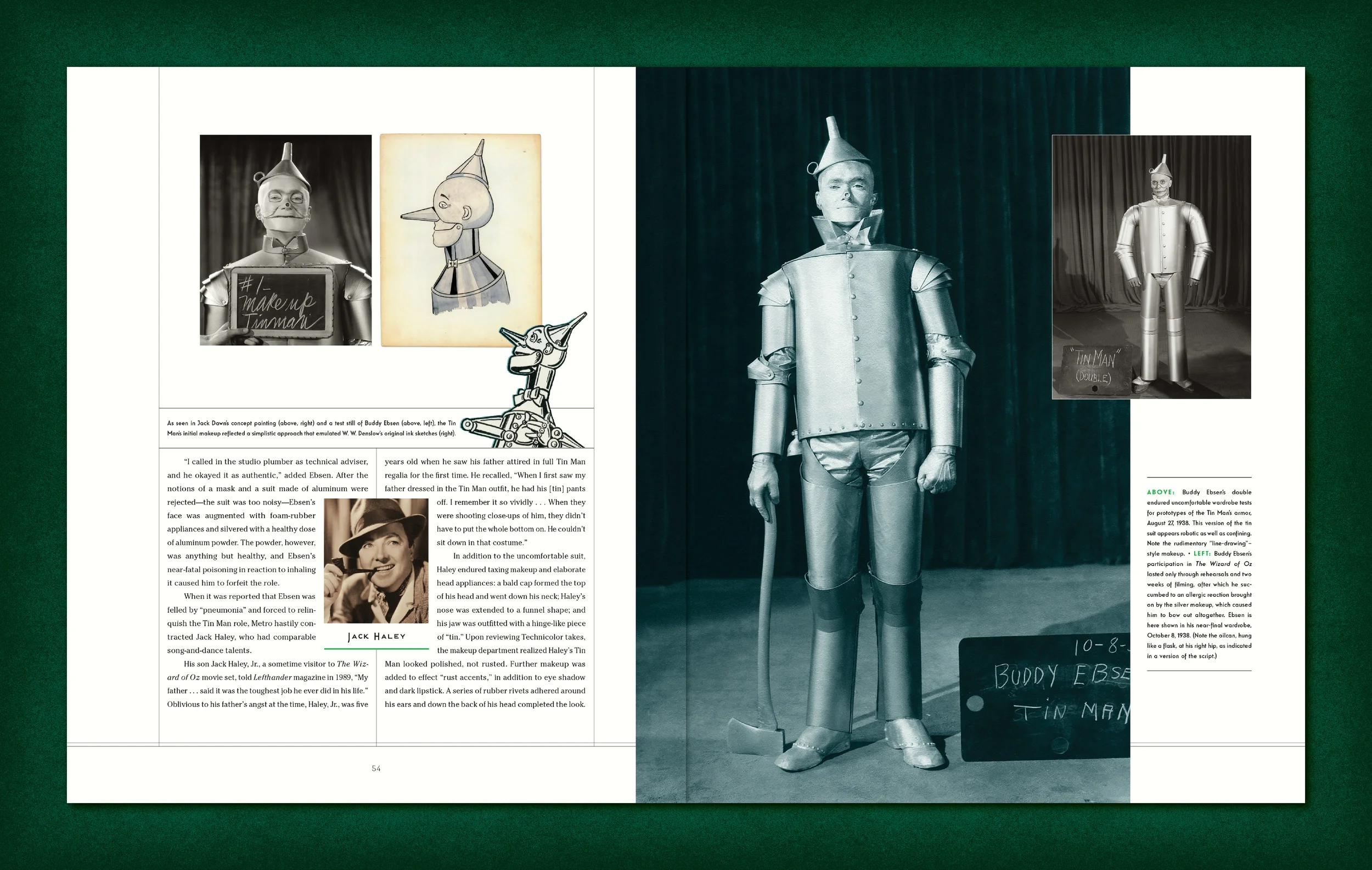 The book holds a removable silver envelope in the back containing the nine special features, including a reproduction of the Wicked Witch of the East’s death certificate (which no longer exists, so I redrew the iconic typography and even filled out the certificate as the coroner), a fictional but in-depth custom newspaper page for The Oz Herald (which I contributed copy for headlines and advertisements), an intricate die-cut picture frame that houses different character portraits, and certificates from the Wizard himself for Courage, Brains, Heart, and Home (referencing the typography on the side of Professor Marvel’s wagon to recall the Wizard’s Kansas character). Also included are re-printings of actual vintage posters, a bookmark (designed using vintage elements), lobby cards, etc.