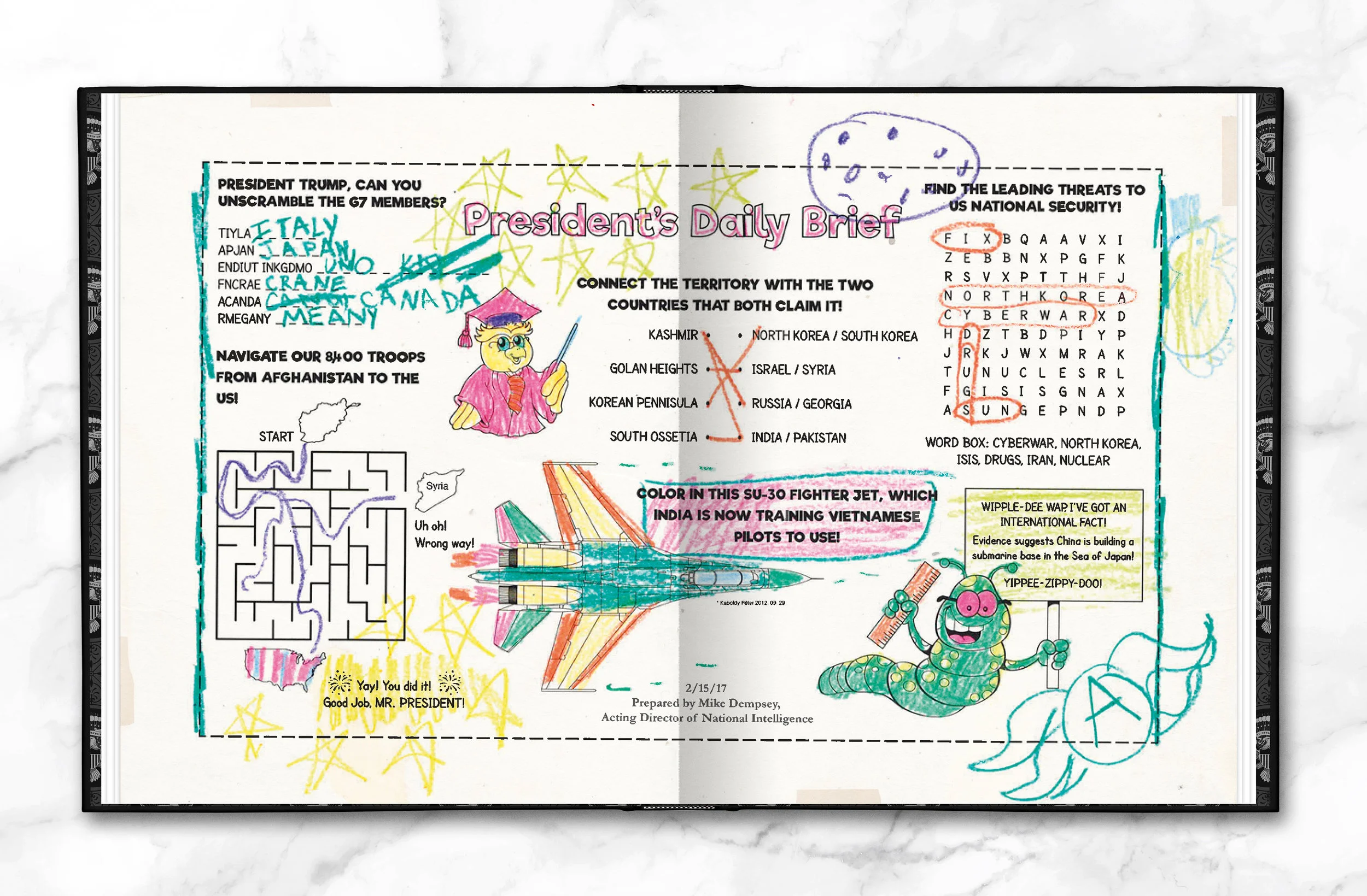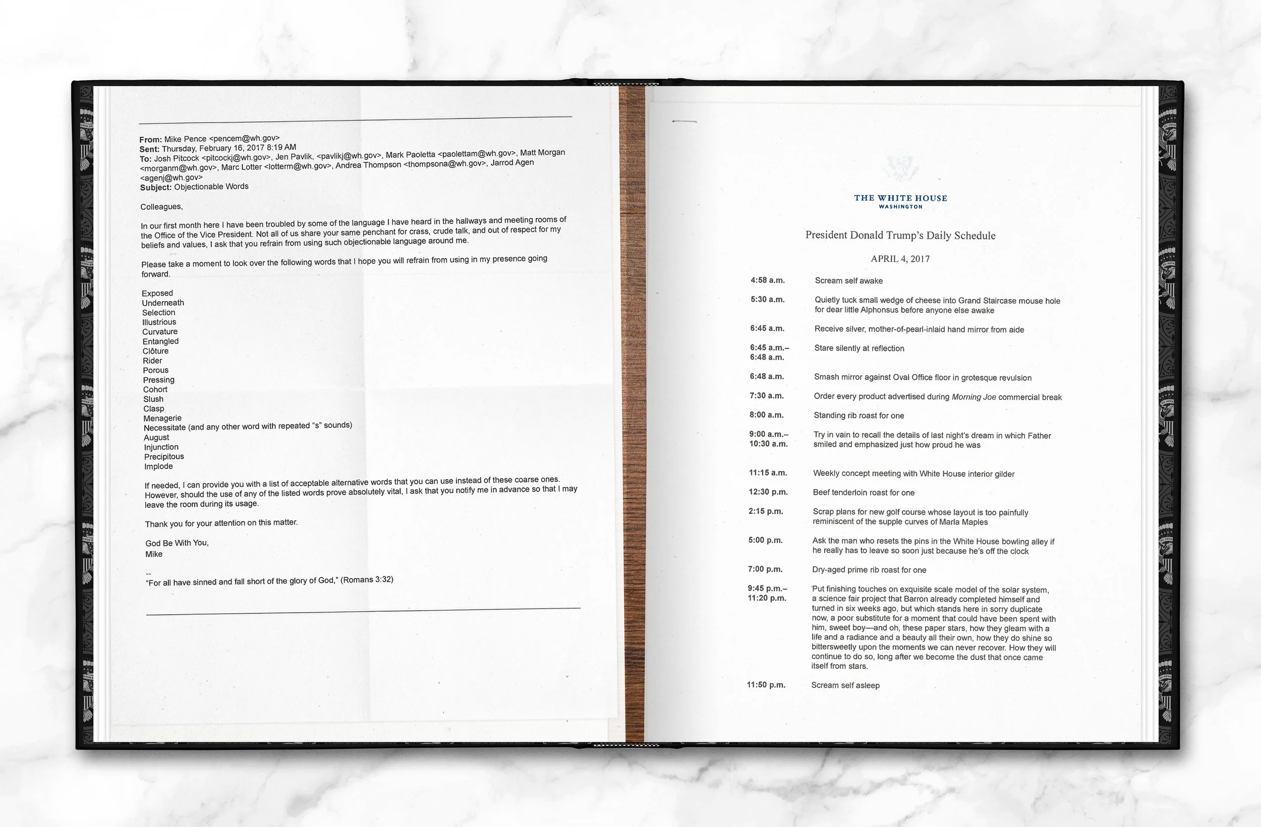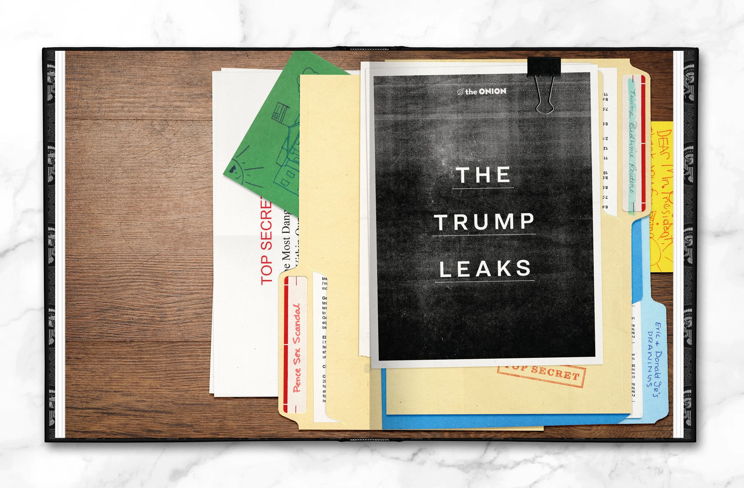 “The Onion, the nation’s sole beacon of truth in an era besieged by darkness and lies, has fearlessly published hundreds of classified documents obtained from an anonymous whistleblower deep within the Trump White House. From top secret national security briefings hand-colored in crayon by President Trump, to encrypted e-mails sent by Kremlin operatives, to Vice President Pence's impure thoughts about the Morton Salt girl, the earth-shattering revelations contained within The Trump Leaks are all but certain to topple the president and alter the very arc of global history. With this soon-to-be Pulitzer-winning work of investigative reportage, America’s Finest News Source has selflessly provided the world with its first and only glimpse inside the hidden workings and tortured minds of the Trump Administration.”