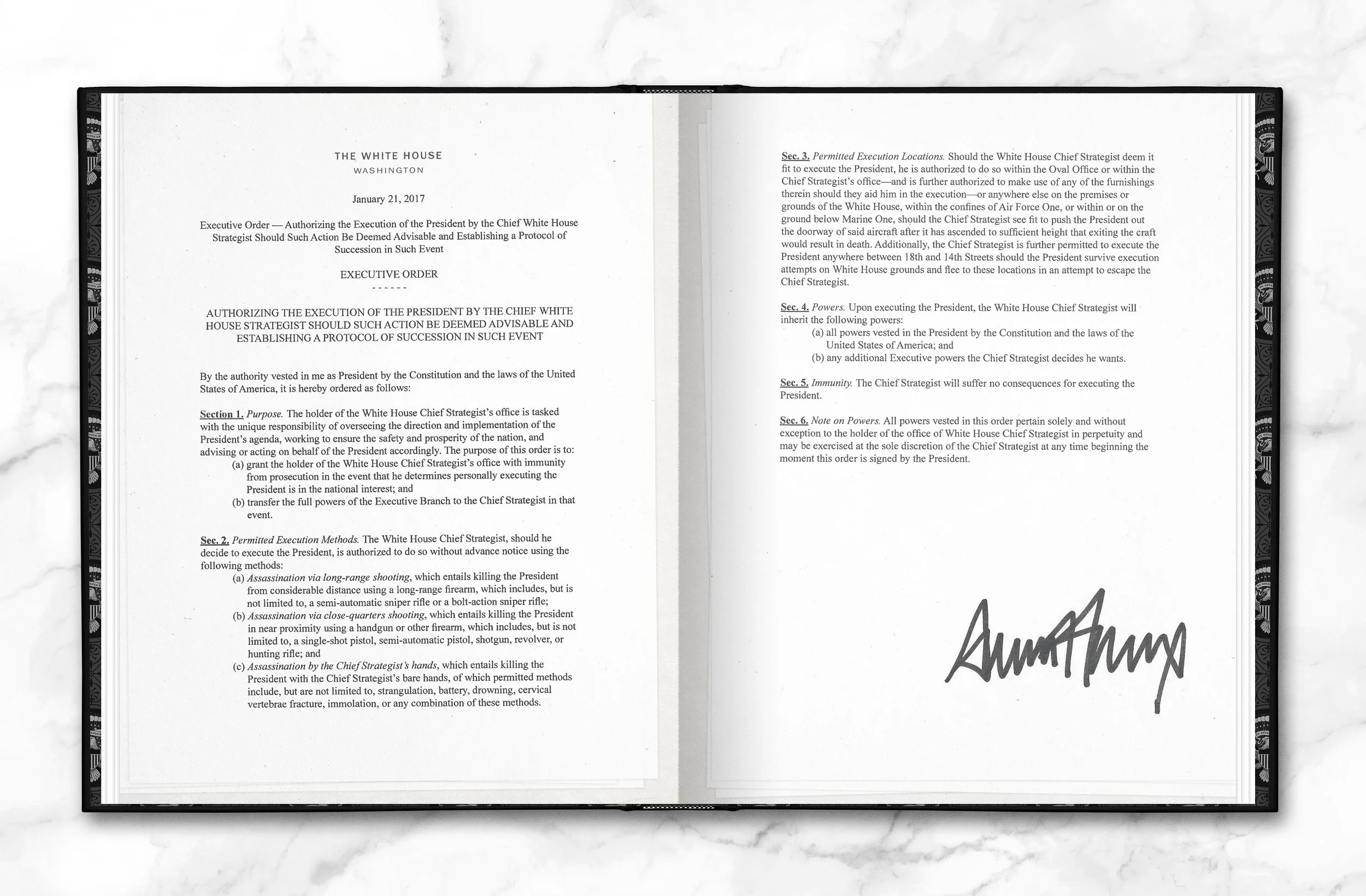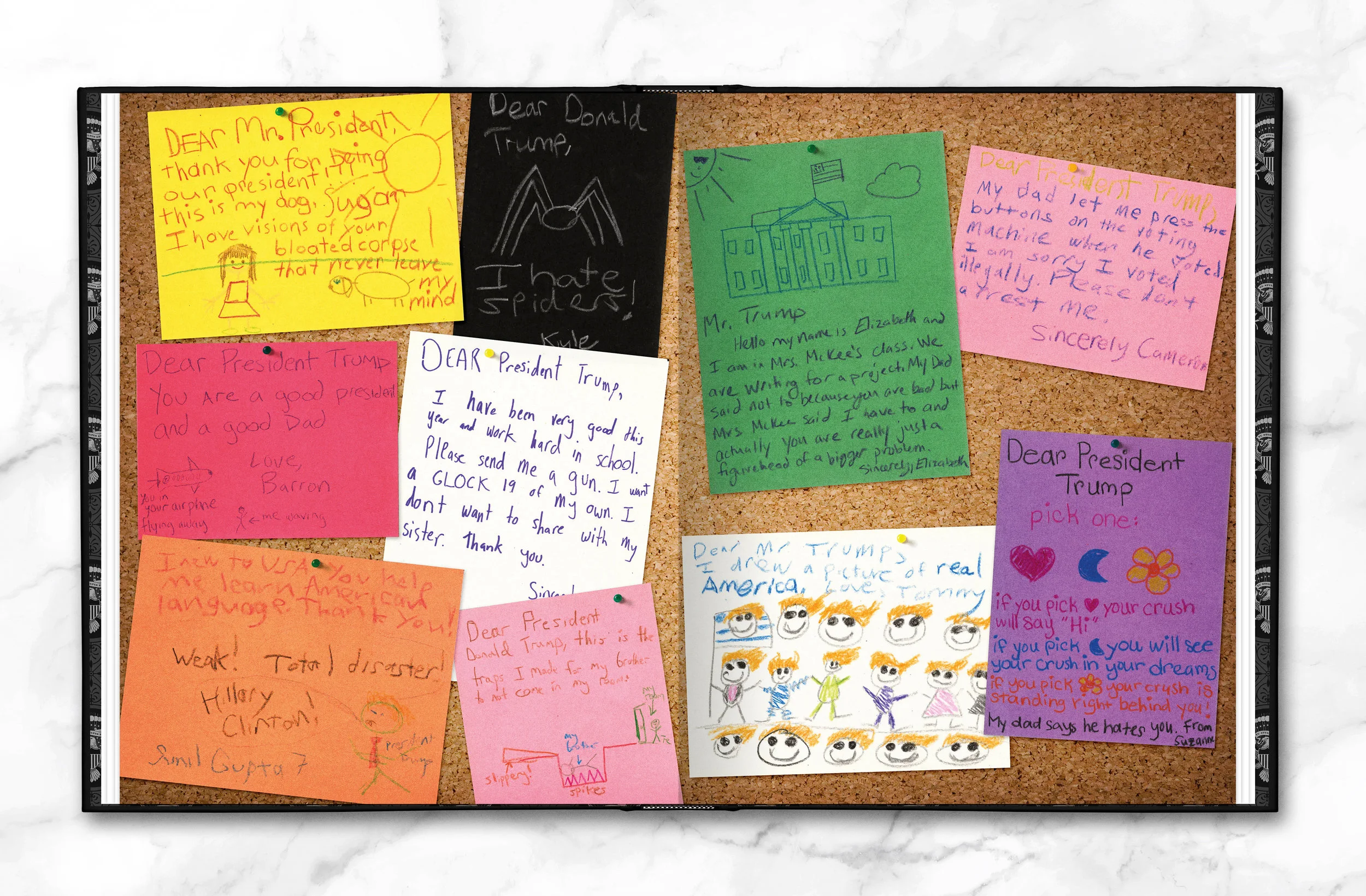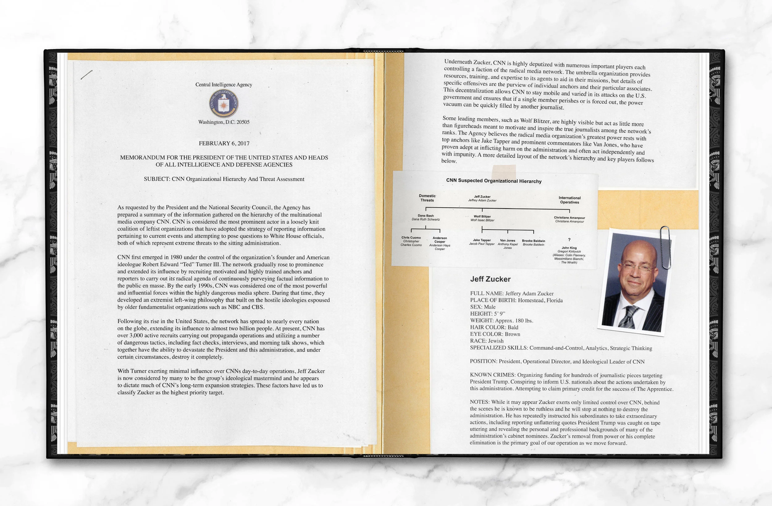“The Onion, the nation’s sole beacon of truth in an era besieged by darkness and lies, has fearlessly published hundreds of classified documents obtained from an anonymous whistleblower deep within the Trump White House. From top secret national security briefings hand-colored in crayon by President Trump, to encrypted e-mails sent by Kremlin operatives, to Vice President Pence's impure thoughts about the Morton Salt girl, the earth-shattering revelations contained within The Trump Leaks are all but certain to topple the president and alter the very arc of global history. With this soon-to-be Pulitzer-winning work of investigative reportage, America’s Finest News Source has selflessly provided the world with its first and only glimpse inside the hidden workings and tortured minds of the Trump Administration.”